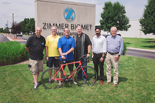 From left to right, Barry McManus – Kosciusko County Velo (KCV) Board Member & Owner of Trailhouse Village Bicycles; Todd Davis – Vice President and General Manager, Knee Reconstruction; Russell Webb – KCV Board Member & Global Product Manager, Primary Knees; Jim Lancaster - Vice President and General Manager, Hip Reconstruction; Rishab Gaba – Quality Engineer & daily bicycle commuter; Fred Helfrich – KCV Board Member & Advocacy Director.